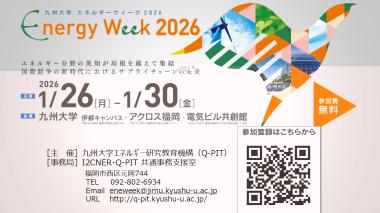 2026年1月26日(月)から30日(金)にかけて、「九州大学エネルギーウィーク2026」を開催いたします。10回目を迎える今回のテーマは、「国際競争の新時代におけるサプライチェーンの未来」です。開催期間中は、学内外のエネルギー関連部局が連携し、国内外の著名な研究者や実務者による講演をはじめ、若手研究者や博士課程学生による研究発表など、多彩なプログラムを予定しています。